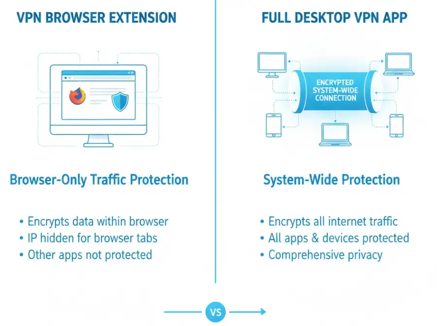 A browser extension protects only the traffic that passes through Firefox itself, making it a lightweight and convenient option for users who primarily care about securing their browsing sessions. In contrast, a desktop VPN app secures all network activity across the entire device, including other browsers, apps, and background processes.