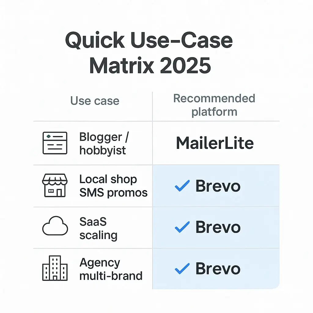 Blogger / hobbyist (with less than 1 000 subscribers) → MailerLite — it’s the cheapest, super-simple to use and has no setup hassle.