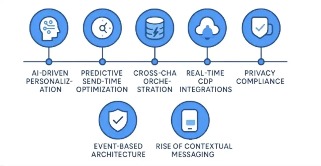 Event-based architecture is replacing traditional batch campaigns, making notifications more relevant and timely. At the same time, stricter privacy regulations and data residency requirements are shaping how platforms store and process user information. As a result, generic broadcast messaging continues to decline, and contextual, behavior-driven communication has become the industry standard for meaningful engagement in 2025.