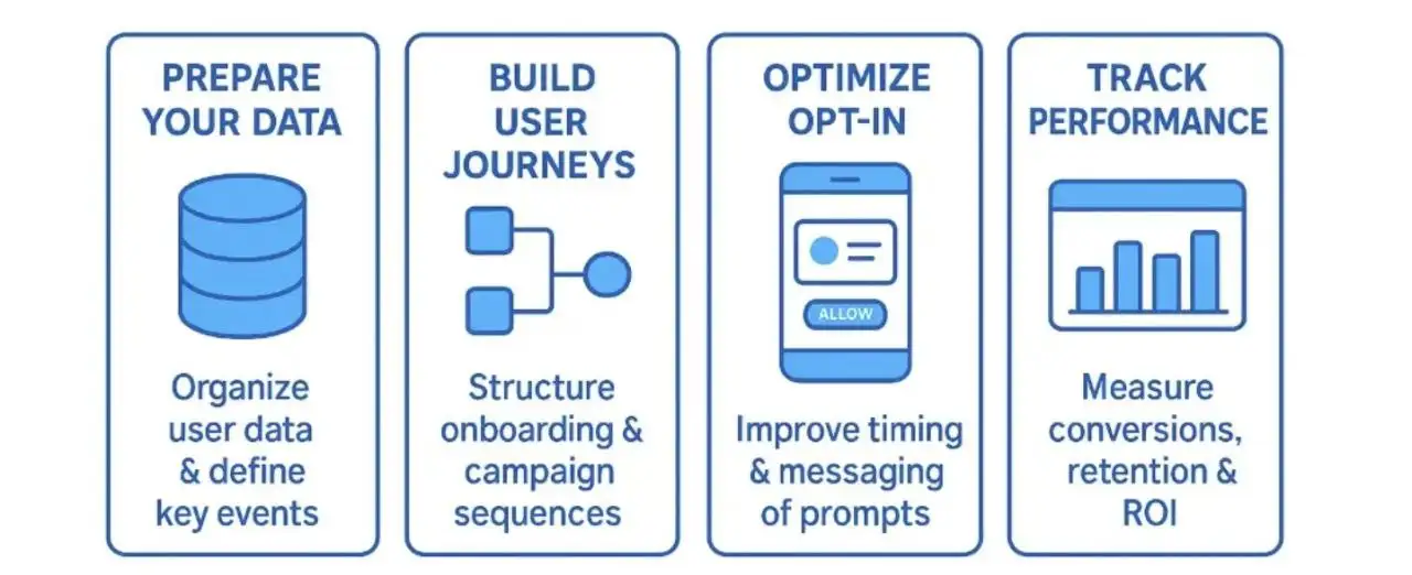 Effective push notification campaigns start with careful preparation. Organizing your user data and defining relevant events ensures that messages reach the right audience at the right moment. Structuring onboarding flows and campaign sequences around the user journey improves engagement and retention.